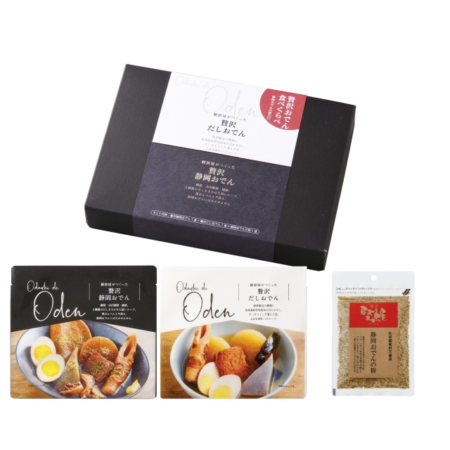 ・贅沢静岡おでん:大根、ゆでたまご、こんにゃく、黒はんぺん、焼きちくわ、牛すじ、さつま揚げ